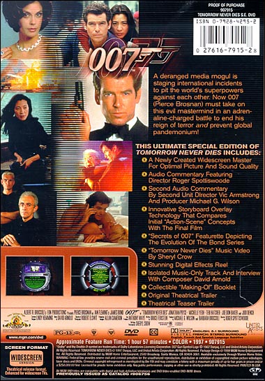 Audio Commentary Featuring Director Roger Spottiswoode Second Audio Commentary By Second Unit Director Vic Armstrong and Producer Michael G. Wilson Innovative Storyboard Overlay Technology that Compares Initial "Action Scene" Concepts with the Final Film "Secrets of 007" Featurette Depicting The Evolution of the Bond Series "Tomorrow Never Dies" Music Video by Sheryl Crow Stunning Digital Effects Reel Isolated Music Only Track and Interview with Composer David Arnold Collectible "Making Of" Booklet Original Theatrical Trailer Theatrical Teaser Trailer |