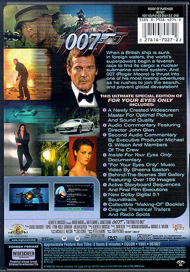 Audio Commentaries: - With Director John Glen - With Producer Michael G. Wilson and Members of the Crew Inside For Your Eyes Only Documentary Music Video by Sheena Easton Behind-The-Scenes Still Gallery Featuring Over 150 Images Active Storyboard Sequences and Final Film Executions Collectible "Making of" Booklet Theatrical Trailers and Radio Spots |