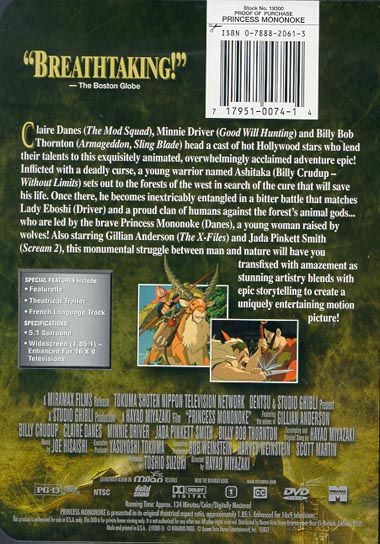 Claire Danes (The Mod Squad), Minnie Driver (Good Will Hunting) and Billy Bob Thornton (Armageddon, Sling Blade) head a cast of hot Hollywood stars who lend their talents to this exquisitely animated, overwhelmingly acclaimed adventure epic! Inflicted with a deadly curse, a young warrior named Ashitaka (Billy Crudup - Without Limits) sets out to the forests of the west in search of the cure that will save his life. Once there, he becomes inextricably entangled in a bitter battle that matches Lady Eboshi (Driver) and a proud clan of humans against the forest's animal gods...who are led by the brave Princess Mononoke (Danes), a young woman raised by wolves! Also starring Gillian Anderson (The X-Files) and Jada Pinkett Smith (Scream 2), this monumental struggle between man and nature will have you transfixed with amazement as stunning artistry blends with epic storytelling to create a uniquely entertaining motion picture! |