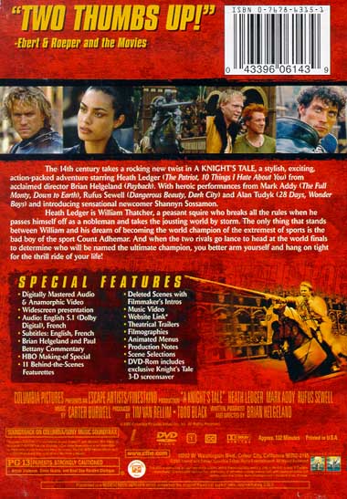 The 14th century takes a rocking new twist in A Knight's Tale, a stylish, exciting, action-packed adventure starring Heath Ledger (The Patriot, 10 Things I Hate About You) from acclaimed director Brian Helgeland (Payback). With heroic performances from Mark Addy (The Full Monty, Down To Earth), Rufus Sewell (Dangerous Beauty, Dark City) and Alan Tudyk (28 Days, Wonder Boys) and introducing sensational newcomer Shannyn Sossamon.