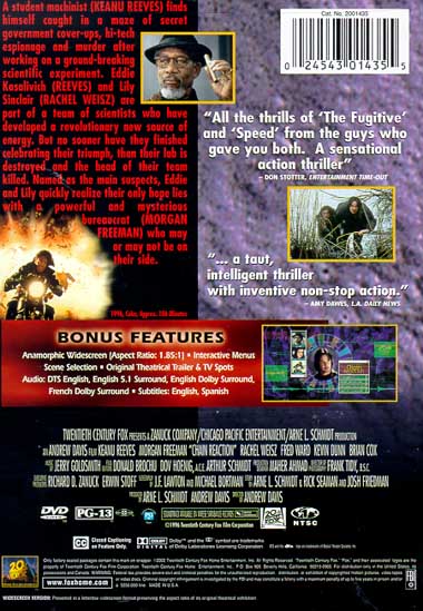 A student machinist (Keanu Reeves) finds himself caught in a maze of secret government cover-ups, hi-tech espionage and murder after working on a ground-breaking scientific experiment. Eddie Kasalivich (Reeves) and Lily Sinclair (Rachel Wiesz) are part of a team of scientists who have developed a revolutionary new source of energy. But no sooner have they finished celebrating their triumph, than their lab is destroyed and the head of their team killed. Named as the main suspects, Eddie and Lily quickly realize their only hope lies with a powerful and mysterious bureaucrat (Morgan Freeman) who may or may not be on their side. |