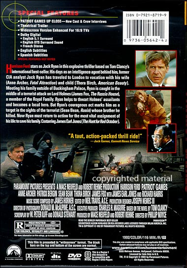 Harrison Ford stars as Jack Ryan in this explosive thriller based on Tom Clancy's international best-seller. His days as an intelligence agent behind him, former CIA analyst Jack Ryan has traveled to London to vacation with his wife (Anne Archer, Fatal Attraction) and child (Thora Birch, All I Want For Christmas). Meeting his family outside of Buckingham Palace, Ryan is caught in the middle of a terrorist attack on Lord Holmes (James Fox, The Russia House), a member of the Royal Family. Ryan helps to thwart Holmes' assailants and becomes a local hero. But Ryan's courageous act marks him as a target in the sights of the terrorist (Sean Bean, Stormy Monday) whose brother he killed. Now Ryan must return to action for the most vital assignment of his life: to save his family. Co-starring James Earl Jones (The Hunt for Red October). |