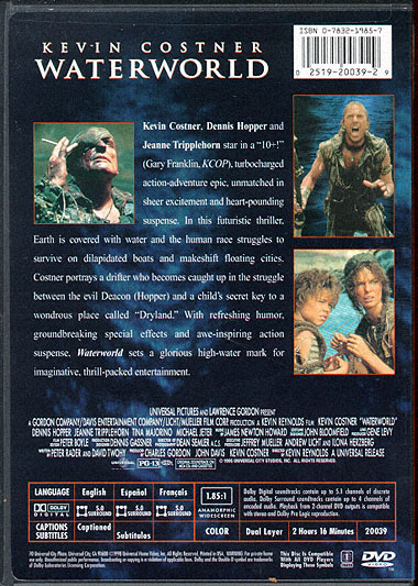 Kevin Costner, Dennis Hopper and Jeanne Tripplehorn star in a "10-!" turbocharged action-adventure epic, unmatched in sheer excitement and heart-pounding suspense. In this futuristic thriller. Earth is covered with water and the human race struggles to survive on dilapidated boats and makeshift floating cities. Costner portrays a drifter who becomes caught up in the struggle between the evil Deacon (Hopper) and a child's secret key to a wondrous place called "Dryland." With refreshing humor, groundbreaking special effects and awe-inspiring action suspense. Waterworld sets a glorious high-water mark for imaginative, thrill-packed entertainment. |