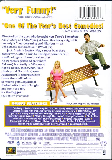 Full-Length Audio Commentary by Directors Bobby Farrelly and Peter Farrelly 11 Deleted Scenes with Optional Farrelly Brothers Commentary HBO "Making Of" Special Comedy Central's Reel Comedy: Shallow Hal Music Video: "Wall In Your Heart" by Shelby Lynne "Seeing Through the Layers" Makeup Featurette "In At The Deep End With Shallow Hal" Stunts Featurette Original Theatrical Trailer |