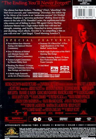 The silence has been broken… "Thrilling (Time), "absorbing" (The Wall Street Journal), and "entertaining" (Newsday), this follow-up to The Silence Of The Lambs is an "audacious success" (Us Weekly)! Anthony Hopkins is "perverse perfection" (Rolling Stone) in his return to the role of Dr. Hannibal Lecter, the sophisticated killer who comes out of hiding to draw FBI agent Clarice Starling (Julianne Moore) into a high-stakes battle that will test her strength, cunning… and loyalty. Drenched in terror, suspense and shocking visual effects, Hannibal is "as compelling a film as you will ever see" (Joel Sigel, "Good Morning America")! |