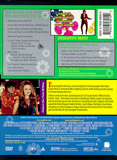 Behind-The-Scenes Documentary Feature Length Commentary with Mike Myers, Director Jay Roach, and co-writer Michael McCullers 20 Minutes Of Deleted Scenes Dr. Evil's Hidden Special Features Page Music Videos - Madonna, Lenny Kravitz, Mel B Four Theatrical Trailers DVD-Rom contents: The entire website - on DVD Trivia Game Web browser and screensavers Three Interactive Episodes take over your desktop Cast, Crew and Trivia Information Updated |