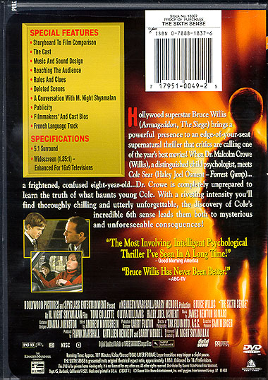 Hollywood superstar Bruce Willis (Armageddon, The Siege) brings a powerful presence to an edge-of-your-seat supernatural thriller that critics are calling one of the year's best movies! When Dr. Malcolm Crowe (Willis), a distinguished child psychologist, meets Cole Sear (Haley Joel Osment - Forrest Gump)…a frightened, confused eight-year-old …Dr. Crowe is completely unprepared to learn the truth of what haunts young Cole. With a riveting intensity you'll find thoroughly chilling and utterly unforgettable, this discovery of Cole's incredible 6th sense leads them both to mysterious and unforeseeable consequences! |