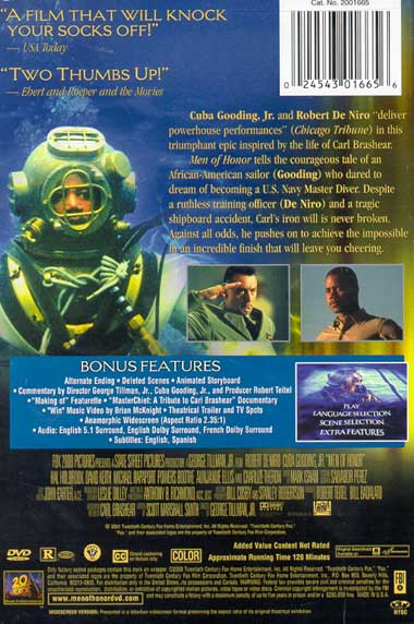 Men of Honor tells the courageous tale of an African-American sailor (Gooding) who dared to dream of becoming a U.S. Navy Master Diver. Despite a ruthless training officer (De Niro) and a tragic shipboard accident, Carl's iron will is never broken. Against all odds, he pushes on to achieve the impossible in an incredible finish that will leave you cheering. |