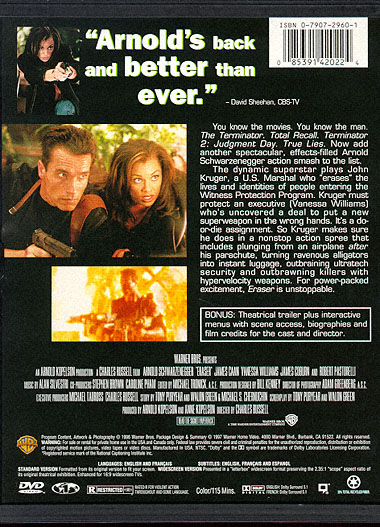 Arnold Schwarzenegger plays John Kruger, a U.S. Marshal who "erases" the lives and identities of people entering the Witness Protection Program. Kruger must protect an executive (Vanessa Williams) who's uncovered a deal to put a new superweapon in the wrong hands. It's a do-or-die assignment. So Kruger makes sure he does in a nonstop action spree that includes plunging from an airplane after his parachute, turning ravenous alligators into instant luggage, outbraining ultratech security and outbrawning killers with hypervelocity weapons. For power-packed excitement, Eraser is unstoppable. |