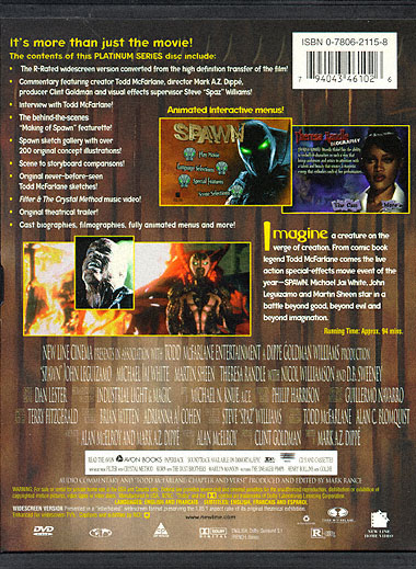 Interactive Menus Audio Commentary Todd McFarlane Interview "Making of Spawn" Featurette Sketch Gallery over 200 Illustrations Scene to Storyboard Comparisons Todd McFarlane Sketches Filter & Crystal Method Video Theatrical Trailer Cast Bios & Filmographies |