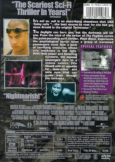 Featurette on the Making-Of Pitch Black Feature Commentaries: Director David Twohy and Actors Vin Diesel and Cole Hauser; David Twohy and Producer Tom Engelman and Visual Effects Supervisor Peter Chiang Raveworld Pitch Black Event Theatrical Trailers |