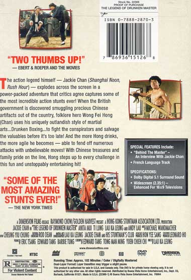 The action legend himself -- Jackie Chan (Shanghai Noon, Rush Hour) -- explodes across the screen in a power-packed adventure that critics agree captures some of the most incredible action stunts ever! When the British government is discovered smuggling precious Chinese artifacts out of the country, folklore hero Wong Fei Hong (Chan) uses his uniquely outlandish style of martial arts…Drunken Boxing…to fight the conspirators and salvage the valuables before it's too late! And the more Hong drinks, the more agile he becomes -- able to fend off numerous attacks with unbelievable moves! With Chinese treasures and family pride on the line, Hong steps up to every challenge in this fun and unstoppable entertaining hit! |