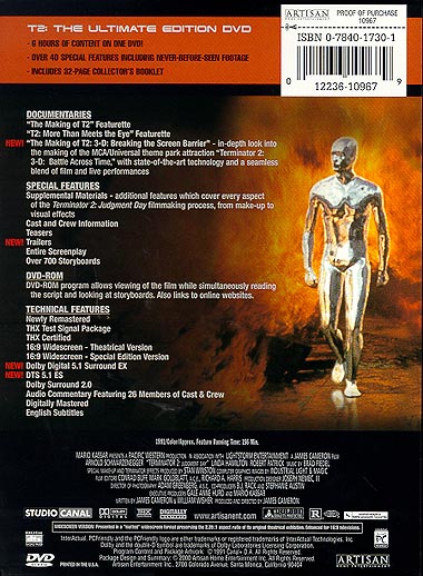THX Certified Includes 32-Page Collector's Booklet "The Making Of T2" Featurette "T2: More Than Meets The Eye" Featurette "The Making Of T2: 3-D: Breaking the Screen Barrier" -- In-Depth Look Into the Making Of the MCA/Universal Theme Park Attraction "Terminator 2: 3-D: Battle Across Time," with State-Of-The- Art Technology and a Seamless Blend of Film and Live Performances Supplemental Materials -- Additional Features Which Cover Every Aspect of the Terminator 2: Judgment Day Filmmaking Process, from Make-Up to Visual Effects Cast and Crew Information Teasers Trailers Entire Screenplay Over 700 Storyboards Audio Commentary Featuring 26 Members of Cast & Crew