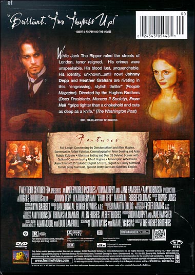 While Jack the Ripper ruled the streets of London, terror reigned. His crimes were unspeakable. His blood lust, unquenchable. His identity, unknown… until now! Johnny Depp and Heather Graham are riveting in this "engrossing, stylish thriller" (People Magazine). Directed by the Hughes Brothers (Dead Presidents, Menace II Society), From Hell "grips tighter than a chokehold and cuts as deep as a knife." (The Washington Post) |