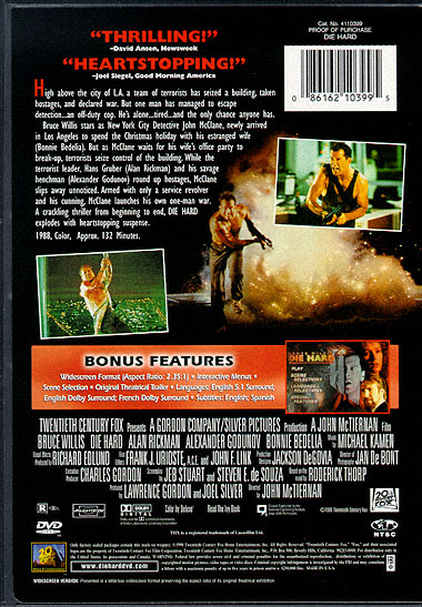 | In this non-stop action classic which ushered in a new genre of action-thrillers, Bruce Willis stars as New York City cop John McClane, Off-duty, and visiting his wife in L.A., McClane find himself back in the line of fire when a group of terrorists seize an office building, trapping him, his estranged wife (Bonnie Bedelia) and dozens of party-goers insider. As hostages are rounded up, McClane slips away and, armed with only a service revolver, launches his own one-man war. |