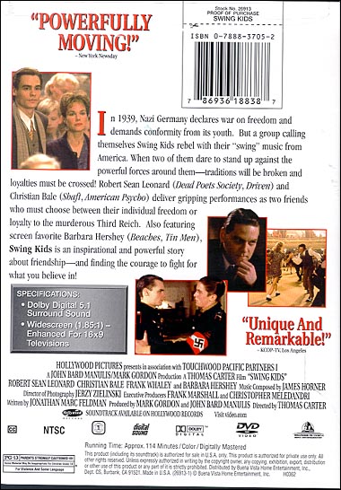 In 1939, Nazi Germany declares war on freedom and demands conformity from its youth. But a group calling themselves Swing Kids rebel with their "swing music" from America. When two of them dare to stand up against the powerful forces around them -- traditions will be broken and loyalties must be crossed! Robert Sean Leonard and Christian Bale deliver gripping performances as two friends who must choose between their individual freedom or loyalty to the murderous Third Reich. Also featuring screen favorite Barbara Hershey. "Swing Kids" is an inspirational and powerful story about friendship -- and finding the courage to fight for what you believe in! |