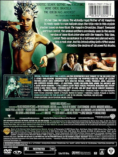 Special Features Befitting A Queen: Aaliyah Remembered pays tribute to the beloved star. 2 other fang-bearing documentaries: Creating the Vampires and The Music of Lestat. Feature-length audio commentary with Director Michael Rymer, Producer Jorge Saralegui and Composer Richard Gibbs. 13 Additional scenes including more among the ancients and a Jesse dream sequence 3 Full-Length Lestat music videos: Forsaken, Redeemer and System . Static X Cold Music Video Extended Slept So Long and Not Meant For Me concert sequences Gag reel Production Book Stills Interactive Menus Theatrical Trailers Cast Film Highlights Scene Access