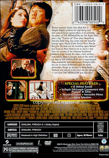 | Action superstar Jackie Chan (Rush Hour 2, Shanghai Knights) combines his high-flying style with state-of-the-art special effects as he unleashes the power of The Medallion, the film Roger Ebert gives a big "Thumbs Up!" Chan plays Hong Kong detective Eddie Yang, who works with the beautiful Interpol agent Nicole (Claire Forlani from Meet Joe Black and The Rock) and the bumbling agent Watson (Lee Evans of Mouse Hunt) to try to rescue a boy from the clutches of the villainous Snakehead (Warlock's Julian Sands). But when a fatal accident ends his life, Eddie is brought back to this world with the help of The Medallion and is supercharged! Now empowered with superhuman strength, Eddie sets out to thwart Snakehead's plan for world domination. Filmed on location in Hong Kong, Thailand, and Ireland. Jackie Chan has got the power - and kicks The Medallion into high gear! |