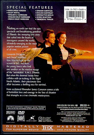 Leonardo DiCaprio and Oscar -nominee Kate Winslet light up the screen as Jack and Rose, the young lovers who find one another on the maiden voyage of the "unsinkable" R.M.S. Titanic. But when the doomed luxury liner collides with an iceberg in the frigid North Atlantic, their passionate love affair becomes a thrilling race for survival. From acclaimed filmmaker James Cameron comes a tale of forbidden love and courage in the face of disaster that triumphs as a true cinematic masterpiece. |