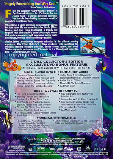 Finding Nemo's breakthrough computer animation is the ultimate viewing experience. This 2-Disc Collector's Edition overflows with something for everyone, including exclusive animation, deleted scenes, games, and more! "Unlike any movie you've ever seen! You could be 5 or 95 and you'll enjoy this film." - Leonard Maltin, Hot Ticket |