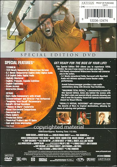 Scene Access Interactive Menus Rare Audio Commentary With Arnold Schwarzenegger and Director Paul Verhoeven Imagining Total Recall Documentary Rekall's Virtual Vacations Visions of Mars Featurette Visual Storyboard Comparisons Conceptual Art Photo Gallery Production Notes Theatrical Trailers and TV Spots Cast and Crew Information