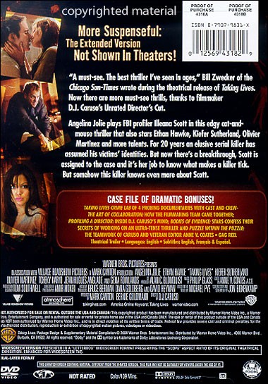 Taking Lives Crime Lab of 4 probing documentaries with cast and crew. The Art Of Collaboration:How the filmmaking team came together. Profiling A Director: Inside D.J. Caruso's mind. Bodies Of Evidence: Stars confess their secrets of working on an ultra-tense thriller, Puzzle Within The Puzzle: The teamwork of Caruso and veteran editor Anne V. Coates. Gag Reel Theatrical Trailer |