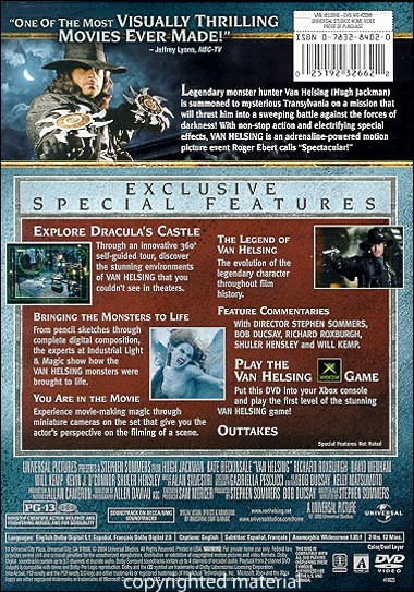 Explore Dracula's Castle Through an innovative 360 Degree self-guided tour, discover the stunning environments of VAN HELSING that you couldn't see in theaters. Bringing The Monsters To Life From pencil sketches through complete digital composition, the experts at Industrial Light & Magic show how the VAN HELSING monsters were brought to life. You Are In The Movie Experience movie-making magic through miniature cameras on the set that give you the actor's perspective on the filming of a scene. The Legend Of Van Helsing The evolution of the legendary character throughout film history. Feature Commentaries With Director Stephen Sommers, Bob Duscay, Richard Roxburgh, Shuler Hensley and Will Kemp Play the Van Helsing Xbox Game Put this DVD into your Xbox console and play the first level of the stunning Van Helsing Game! Outtakes