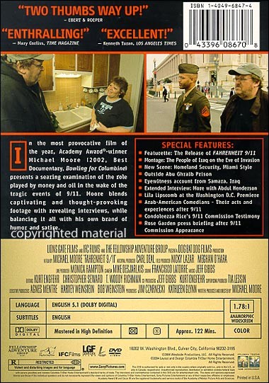 Featurette: The Release of FAHRENHEIT 9/11 Montage: The People of Iraq on the Eve of Invasion New Scene: Homeland Security, Miami Style Outside Abu Ghraib Prison Eyewitness account from Samara, Iraq Extended Interview: More with Abdul Henderson Lila Lipscomb at the Washington D.C. Premiere Arab-American Comedians - Their acts and experiences after 9/11 Condoleezza Rice's 9/11 Commission Testimony Rose Garden press briefing after 9/11 Commission Appearance |