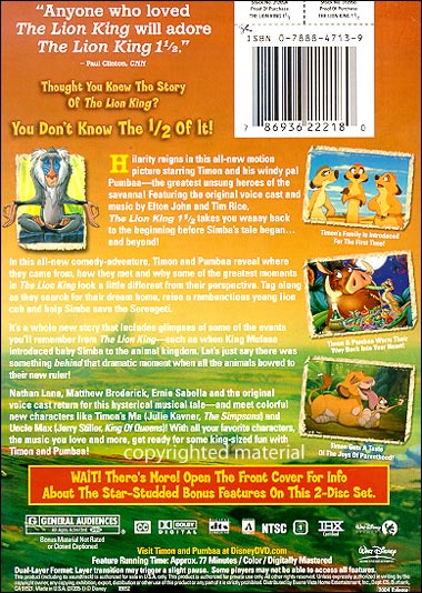 Hilarity reigns in this all-new motion picture starring Timon and his windy pal Pumbaa - the greatest unsung heroes of the savanna! Featuring the original voice cast and music by Elton John and Tim Rice, The Lion King 1 1/2 takes you waaay back to the beginning before Simba's tale began...and beyond!