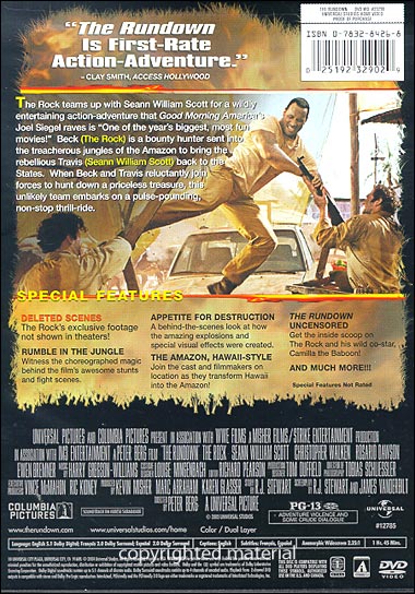 | Deleted Scenes - The Rock's exclusive footage not shown in theaters! Rumble in the Jungle - Witness the choreographed magic behind the film's awesome stunts and fight scenes. Appetite for Destruction - A behind-the-scenes look at how the amazing explosions and special visual effects were created. The Amazon, Hawaii-Style - Join the cast and filmmakers on location as they transform Hawaii into the Amazon! The Rundown Uncensored - Get the inside scoop on The Rock and his wild co-star, Camilla the Baboon! And Much More!!! |