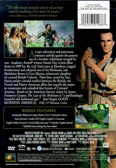| An epic adventure and passionate romance unfold against the panorama of a frontier wilderness ravaged by war. Academy Award winner Daniel Day-Lewis (Best Actor in 1989 for My Left Foot) stars as Hawkeye, rugged frontiersman and adopted son of the Mohicans, and Madeleine Stowe is Cora Munro, aristocratic daughter of a proud British Colonel. Their love, tested by fate, blazes amidst a brutal conflict between the British, the French and Native American allies that engulfs the majestic mountains and cathedral-like forests of Colonial America. Based on the American literary classic by James Fenimore Cooper, The Last Of The Mohicans is "a spellbindingly beautiful old-fashioned epic." (Joel Siegel, Good Morning America) |