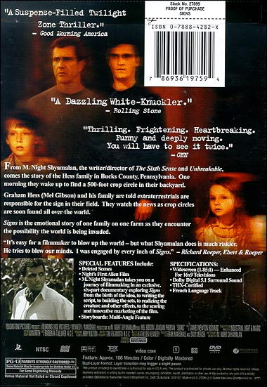 Deleted Scenes Night's First Alien Film Storyboards: Multi-Angle Feature THX-Certified M. Night Shyamalan takes you on a journey of filmmaking in an exclusive, six part documentary exploring Signs from the birth of the idea, to writing the script, to building the sets, to realizing the creature and other effects, to the scoring and innovative marketing of the film. |